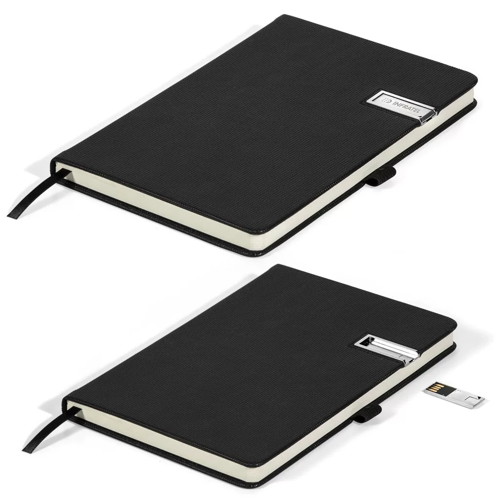 This sleek A5 notebook is designed with a built-in 8GB USB memory stick, securely stored inside the cover and easily removable for use.