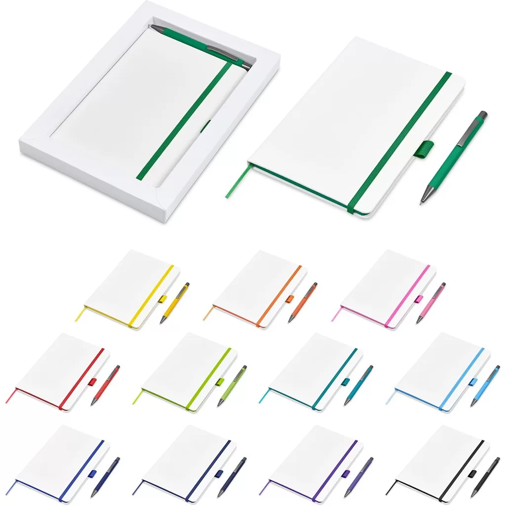 The matching matte textures of this notebook and pen, combined with the colour accents, makes them perfect partners. The set is packaged together in a box with a firm cardboard base and a transparent acetate lid, which provides bright and clear exposure for your branding.