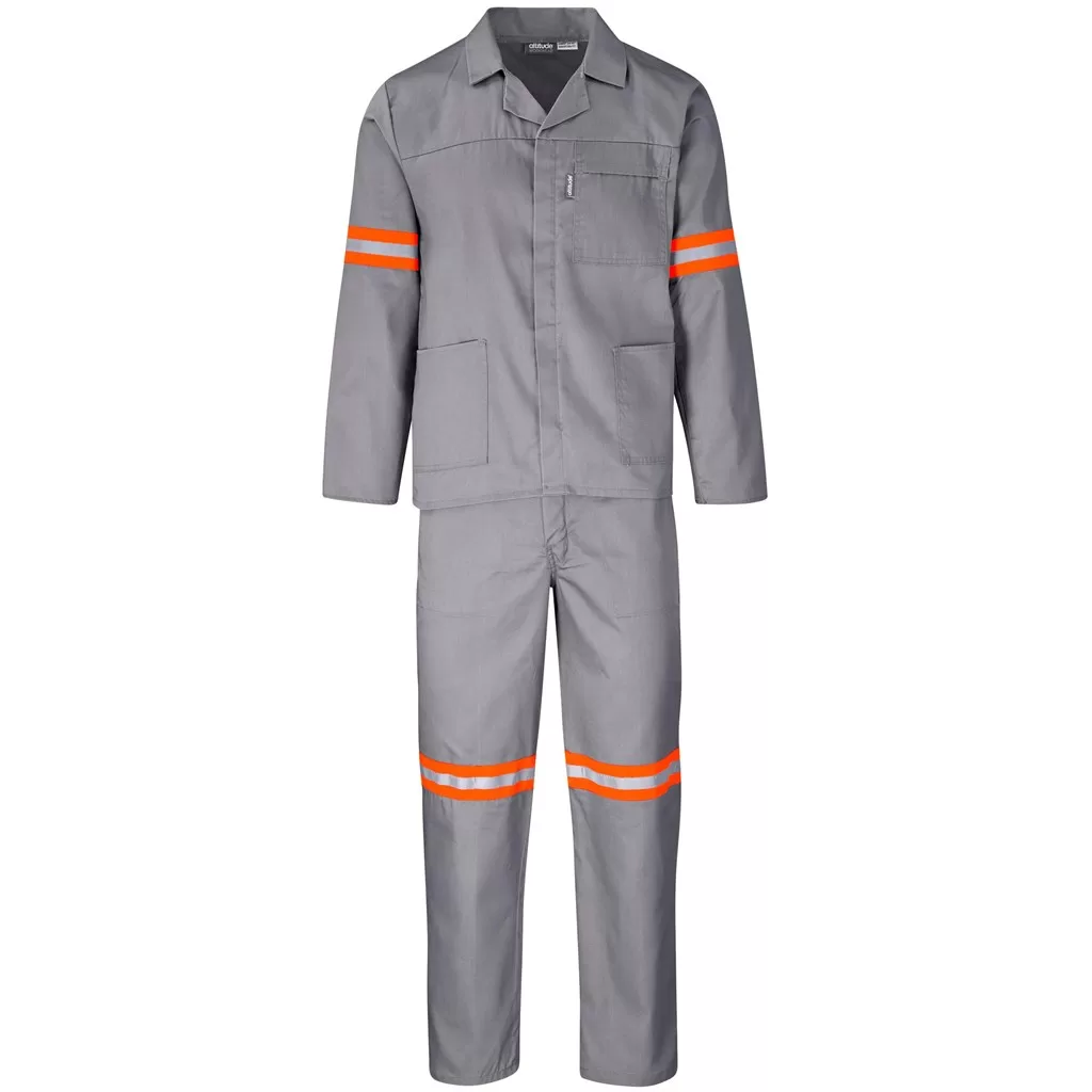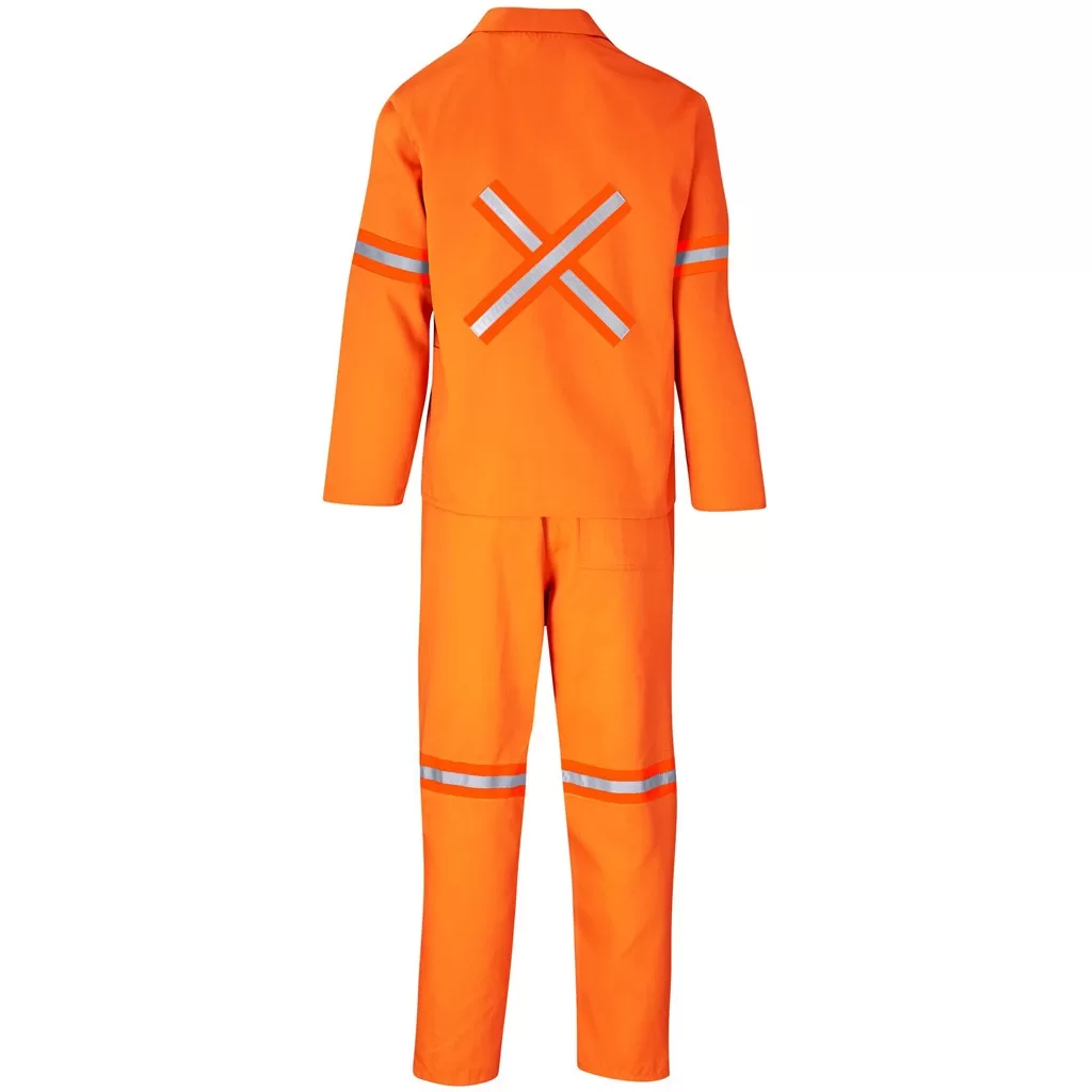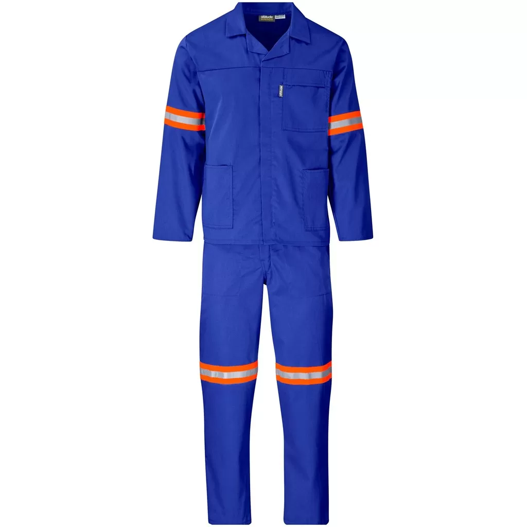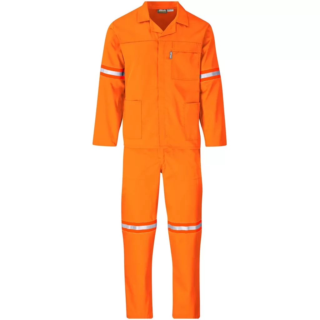 Orange-taped Conti Suit: 190g/m² polycotton, reflective on arms, legs, and back. SABS-approved for industrial work environments.
